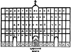 Над царскими вратами расположена икона Тайная Вечеря. Она как бы является частью второго чина. Вторым же может быть чин праздничный, с иконами, посвященными церковным праздникам, которых должно быть не менее двенадцати, по числу великих праздников, либо чин деисусиый. «Деисус» по-гречески означает моление. В центре чина находится изображение Спаса Вседержителя, Судии, а по сторонам в позах моления ему предстоят Богородица, Иоанн Предтеча, архангелы Михаил и Гавриил и апостолы. Третий чин — пророческий. Обычно в центре его находится икона София — Премудрость Божия, а по сторонам со свитками в руках — пророки. Самый верхний, пятый чин — праотеческий. В центре его икона Троицы Новозаветной или Отечество, а по сторонам ее — изображения праотцов. Венчает иконостас распятие.