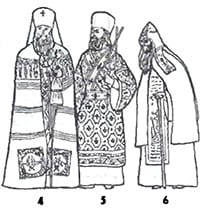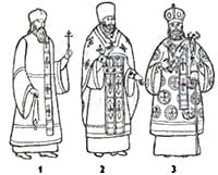 Архиереи вне богослужений и торжественных актов, как монахи, носят подрясники со скуфьями либо рясы с клобуками. При богослужении они облачаются в подризник, епитрахиль, пояс, поручи, но вместо набедренника у них на правом бедре висит палица, а риза заменяется саккосом. Саккос похож на укороченный снизу и в рукавах стихарь, так что из-под него видны подризник и епитрахиль. С боков и на рукавах саккос разрезан, и вдоль разрезов нашиты небольшие бубенцы. По постановлениям собора 1675 г. саккос принадлежал лишь патриарху и митрополитам, а архиепископы и епископы при богослужении надевали, как и священники, фелонь, но с 1705 г. саккос стал принадлежностью богослужебного облачения всех архиереев. На плечах поверх саккоса архиереи носят омофор — широкую украшенную крестами парчовую ленту, охватывающую шею и свисающую с левого плеча спереди и сзади. На голову по постановлению собора 1675 г. архиереи надевали епископскую шапку, сферический колпак с меховым околышем, а патриарх — митру со стоячим бриллиантовым крестиком. В начале XVII! в. право ношения митры с крестом получили все украинские архиереи и даже игумены и великороссийские архимандриты, а в конце XVIII в. митру, но без креста, получили все российские архиереи и в качестве награды ее стали получать знатнейшие протоиереи, крест же стал принадлежностью митр только у митрополитов. Поверх саккоса на груди висят наперсный крест и панагия — небольшой круглый, овальный или ромбический образ Спасителя или Богородицы, украшенный филигранью и драгоценными камнями. Собором 1675 г. архиереям было предоставлено на выбор носить панагию или наперсный крест, но с 1742 г. они носили только панагию. С появлением наградных синодальных и кабинетских крестов, а также крестов докторов богословия у архиереев сочетание панагии и креста стало довольно частым. Панагия служит также наградой для архиереев и у митрополитов на груди иногда можно увидеть две панагии. В некоторых случаях архиереи появляются в мантии — широкой, очень длинной, со шлейфом и скрепленными верхними и нижними углами. По постановлениям собора 1675 г. епископы имели красные мантии, архиепископы зеленые, митрополиты голубые; цвет мантии патриарха зависел от его усмотрения. В верхние и нижние углы пат- риаршей мантии вшивались скрижали, парчовые прямоугольники с изображением креста. Тёмнокрасные скрижали на черные мантии получили и архимандриты некоторых знаменитых монастырей. В начале XVIII в. на скрижалях мантий архимандритов некоторых знаменитых монастырей стали изображаться святые — основатели этих монастырей. Вообще в XVIII в. у некоторых архиереев имело место разнообразие мантий, дарившихся им монархами, вплоть до фиолетовых мантий с красными скрижалями. С начала XIX в. установилось единообразие мантий и скрижалей. На груди и внизу, у углов, в мантию вшиваются парчовые скрижали — вставки прямоугольной формы с изображениями крестов или святых в орнаменте. На груди, подоле и посередине тела на мантию нашиваются двойные атласные ленты — струи или истоки. Поверх мантии на шею, а вне богослужения в торжественных случаях и поверх саккоса надевается более короткий омофор, и концы его свисают на грудь.