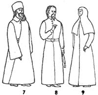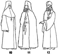 Малосхимники и великосхимники поверх рясы «на выход» для участия в богослужении и в прочих торжественных случаях надевают широкую длинную мантию, закрывающую все тело до пят. Великосхимники под мантию надевают на шею аналав — расшитый белыми нитями длинный широкий кусок ткани. На нем изображается распя- тие с орудиями мучения и сопровождающие его надписи и молитвы. Монахи на голове носят клобук. До середины XVII в. он имел вид мягкого сферического колпака с тремя короткими закругленными лопастями-воскрилиями. В дальнейшем такой клобук сохранили старообрядцы и патриархи. В 1656 г. был принят жесткий цилиндрический клобук, точнее камилавка, невысокий цилиндр без полей, на которую надевалось черное креповое покрывало, намет, с длинными воскрилиями, из которых заднее было значительно шире и длиннее и сшивалось внизу наподобие мешка. В XVIII в. клобук слегка суживался кверху, с конца XVIII в. стал принимать форму правильного цилиндра, но до середины XIX в. еще встречались суживающиеся клобуки. Во второй половине XIX в. клобук стал все чаше немного расширяться кверху. У митрополитов клобук белый. Во второй половине XVIII в. митрополитам, а с 1783 г. и архиепископам в качестве награды стали давать на клобук небольшой бриллиантовый крестик, который в дальнейшем превратился в отличительный знак этих двух санов. У патриархов клобук белый, старинной формы в виде сферического колпака с короткими закругляющимися воскрилиями; на очелье и концах воскрилий патриаршего клобука золотом вышиты серафимы, а на макушке укреплен стоячий бриллиантовый крестик.