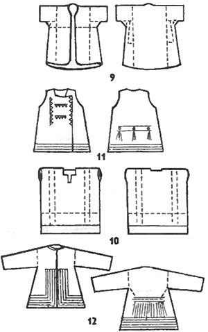 Верхняя женская одежда в основном повторяла формы мужской. Но в Поволжье в комплексе с сарафаном носили верхнюю одежду особых форм. Это были холодники, ватошннкн, монаркит стуколки, душегреи примерно одинакового покроя: длиной до середины бедер, в талию, с прямым или отложным воротником и с большим количеством сборов сзади. Шили эту одежду из домотканого сукна, красного штофа, сатина, отделывали бархатом, галунами. В южных поволжских губерниях носили бедуим. Это халатообразная одежда длиной ниже колен, немного расширявшаяся книзу, распашная, с отложным воротником и широкими прямыми рукавами, вшивавшимися в проймы сильно присборенными. Воротник украшали бисером, шелковыми кистями, бархатной обшивкой. Бедуим носили не застегивая и не подпоясывая. Кое-где в Самарской губернии носили корсетки на шнуровке, а в Казанской и Симбирской — душегреи на лямках. Девичьим головным убором в сарафанном комплексе, как и в поневном, были повязки, перевязки или ленты — более или менее широкие полосы штофа, бархата, шелка на твердой основе, в виде обруча, завязывавшиеся под косой тесемками. Над тесемками пришивали одну широкую или несколько узких лент. Лобную часть убора обычно вышивали золотой нитью, украшали воланами или сетками из жемчуга, бисера. В качестве свадебного головного убора на Севере использовалась коруна — очень широкий ажурный, богато украшенный обруч. Ее аналогом был венец — вырезной ажурный невысокий обруч с сильно расходящимися наружу краями. В Поволжье была распространена фатка — шелковый, обычно красный платок, сложенный на угол и заложенный в виде полосы; он прикрывал теменную часть головы и завязывался сзади под косой. В косы вплетались ленты-косоплетки с привязанными к ним длинными шелковыми лентами, а иногда с косником в виде одного-двух треугольных лепестков, вышитых бисером и стеклярусом.