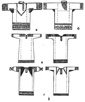 Большую группу женских рубах составляют рубахи с поликами — вставками ткани на плечах, между воротом и рукавами. Различаются рубахи с косыми поликами, имеющими форму ромба, с прямыми noликами, пришитыми по основе, т.е. по продольным нитям холста, и с прямыми поликами, пришитыми по утку — поперечным нитям холста. Полики нередко делались из затканки — специально тканой орнаментированной материи. Есть также группа бесполиковых рубах: рубаха с воротушкой — круглой вставкой у ворота, рубаха с рукавами, пришитыми к вороту и присборенными вокруг него, и рубаха на кокетке — покрой более поздний, пришедший из города.