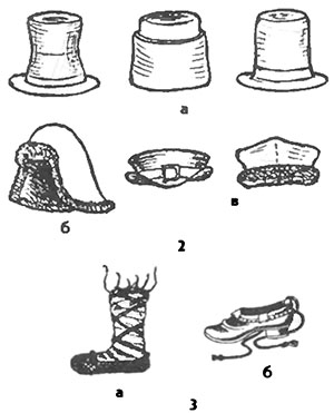 Обувались в лапти с онучами, рабочей обувью были ступни или босовики, а праздничной — смазанные дегтем сапоги из толстой кожи.