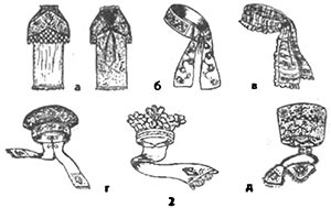Были и другие детали, варианты форм и названий. Например, в Смоленской губернии носили высокие рогатые стеганые кички, под которые подкладывали жгут из пакли. Поверх кички надевали сороку, налобник, позатыльник, махры, подкосник, вислючки, а сверх всего этого еще и наметку. Она имела вид длинного полотенца из тонкого белого домашнего холста, сложенного в полосу, которым трижды оборачивали кичку; концы наметки с цветной бахромой закладывали по бокам головы или завязывали сзади и распускали. На концах наметки вышивали гладью геометрический или стилизованный растительный орнамент, нашивали полоски кумача, ленты, тонкие кружева. Девушки носили наметки покороче и без кички, так что макушка головы оставалась открытой. В конце XIX в. в Смоленской губернии носили сборник — надрезанный с одной стороны кусок ткани, закладывавшийся на голове в складки, а также подубрусник, стеганый из холста или бархата, в виде шитого золотом повойника с твердым околышем из дошечки; на холщовый подубрусник накидывали сложенный на угол платок с завязанными сзади, «по-бабьему», концами.