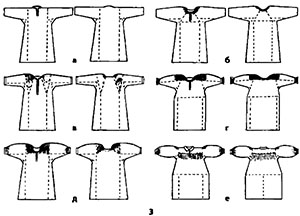 Наиболее архаичным типом женской рубахи является рубаха туникообразная, в виде длинного холста, перегнутого на плечах, с вырезным воротом и вшитыми, как у мужской рубахи, бочками и рукавами; нередко туникообразная рубаха имела и ластовицы. Отличалась она от мужской рубахи только длиной до пят и отсутствием подоплеки. Позднее такая рубаха стала чисто старушечьей и обрядовой, смертной одеждой.