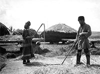Место, где скирды стоят как под солнцепеком, так и под дождем, по-черемисски называется идым Его соответствием у нас является постройка рига с прилежащими к ней другими помещениями. Но у черемисов, по крайней мере у восточных, на этом месте — на току — обычно нет никакого сооружения. Молотьбу производят на земле, на твердом утоптанном месте. Когда в доме кончается обмолоченный хлеб, со скирды берут снопы, сушат их на открытом воздухе и молотят их на току деревянными молотильными цепами. Соринки и мякину отделяют от зерна, используя силу ветра, путем подбрасывания семян большими деревянными лопатами в воздух. После этого зерно высушивается либо в бане на колосниках, либо в печи избы на вогнутых досках. В некоторых местах на току построен соломенный навес для защиты от дождя; кроме того, на его торцевой стороне некоторые делают и сушильную баню — следовательно, имеется уже начало, хотя и скромное, для постройки риги. О том, что хлеб обмолачивают с помощью парового двигателя, черемис не имеет ни малейшего понятия, и он никогда не намолотит себе больше, чем ему нужно на данный момент.
