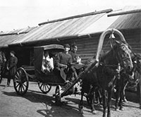 Поблизости от поезда по дороге идет караван. В углу первого воза развевается небольшой красный флаг. Обоз, похоже, идет в сторону отдаленного села. В кювете, на обочине дороги, длиннобородые крестьяне стоят и ждут со своими обозами. У сидящего рядом старика я выясняю, какое значение имеет флаг у головного обоза. Получаю ответ, что идет транспортировка «казенного напитка». Флаг — знак для встречных, чтобы они поняли, что необходимо посторониться: как полагается, казенный обоз другим дорогу не уступает.