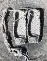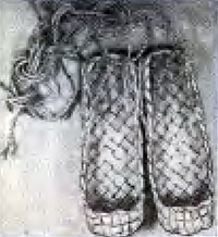 оттенков) и черных ниток; плетеная из лыка обувь, носившаяся в