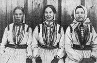 Своеобразной была манера украшения одежды, характерная только для данного комплекса начала ХХ в.: вышивка украшалась пучками цветной шерсти, городчатой тесьмой, вязаными кружевами, плоскими белыми пуговицами и блестками.