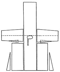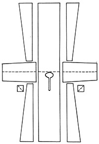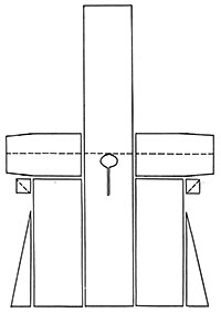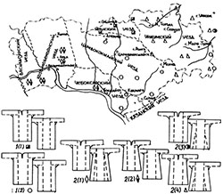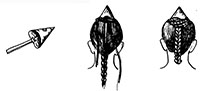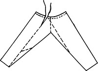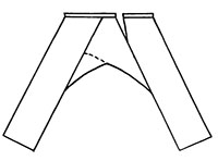 шились из двух цельных точей холста, которые составляли штанины, между которыми вставлялся косой клин. Носили их при помощи продетой в пояс вздержке-гашнике. В.Н.Белицер считала этот тип, названный ею штанами с узким шагом, наиболее архаичным, распространенным среди русских, башкир, татар, мордвы, удмуртов (рис. 28). Исследовательница отнесла их к первому типу штанов с узким шагом.