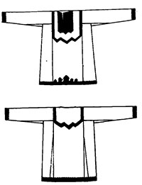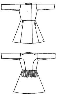 Демисезонные кафтаны (мыжер) с вырезной проймой шили двух вариантов: 1) прямоспинный кафтан с шалевым воротником (рис. 31); 2) кафтан с глухим или шалевым воротом, отрезной в талии сзади, с запахом на левую сторону (рис. 32). Теплые кафтаны шили из домашнего сукна, праздничные - из белого (ош мыжер), а будничные - из черного (шем мыжер). Белые кафтаны обшивались черной домотканной тесьмой. «Мыжер» подпоясывался кушаком. Состоятельные семьи покупали на праздничные кафтаны фабричное сукно (посто мыжер). У восточных марийцев наряду с вышеописанными кафтанами бытовали кафтаны, характерные для тюркского населения (камзол, легкий бешмет).