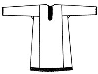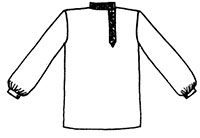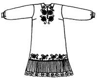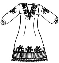 Платье с атласным фартуком обычно носят в праздники в тех районах республики,где расселены луговые марийцы. Однако этот комплекс национальной одежды пожилые женщины северо-восточных районов надевают редко. Старые и пожилые марийки этой части республики пользуются туникообразной рубахой из фабричной белой льняной ткани, коленкора или бязи с небольшой вышивкой крестом у грудного разреза и на подоле (рис.40). Подобную рубаху называют «шымакшан тувыр» (рубаха мариек, носивших в прошлом головной убор шымакш), подчеркивая принадлежность к определенной локальной группе луговых марийцев. С туникообразной рубахой они носят летний белый кафтан, как это сочеталось в традиционном народном костюме. В то же время поверх платья с оборкой подобный кафтан не надевается.
