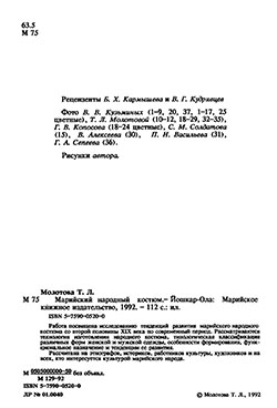 Книга посвящена народному костюму марийцев, живущих в основном в пределах Марийской республики. Выбор темы исследования определился особенностями в этой сфере культуры - бытованием у части сельского населения форм народной одежды не только как празднично-обрядовой, но и повседневной. Отсутствие специальной работы и накопленный материал по этой теме вызвали необходимость создать обобщающее исследование о марийском народном костюме. Рассматриваются материалы для изготовления костюма, типологическая классификация отдельных форм и элементов женской и мужской одежды, костюмные комплексы луговых и горных марийцев, функциональное назначение костюма, характеристика основных тенденций развития народного костюма. В книге впервые даны карты распространения отдельных форм одежды и ее локальных комплексов. Наличие основной источниковой базы позволило определить хронологические рубежи исследования - вторая половина Х1Х-80 -е годы ХХ в. В работе использованы вещественные (музейные), архивные и полевые этнографические материалы. Ценным источником являются материалы коллекций, архивов и фотоколлекций Российского этнографического музея, Музея антропологии и этнографии Российской Академии Наук в Санкт-Петербурге, содержащие богатейшие собрания по культуре и быту марийцев. Интересные сведения о дореволюционном костюме получены из коллекций Государственного музея Татарской республики и Этнографического музея Казанского государственного университета. В исследовании использованы материалы научно-рукописного фонда Марийского научно-исследовательского института. Важным источником при создании книги послужили и полевые наблюдения автора в 1976, 1978-80, 1982, 1985-90 годах во всех районах республики, а также за ее пределами.